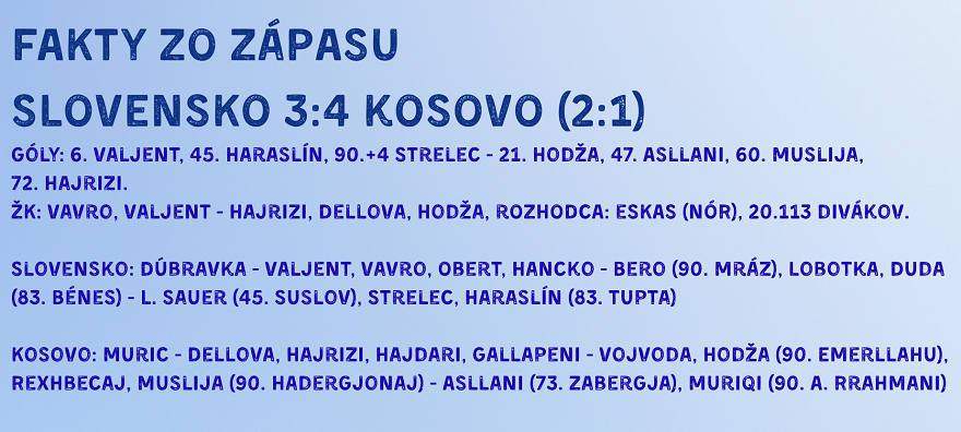 Slovenská futbalová reprezentácia prehrala v semifinále baráže MS 2026 s Kosovom 3:4 a prišla o šancu zahrať si na šampionáte v USA, Kanade a Mexiku. V utorok sa stretne v priateľskom zápase proti Rumunsku, Kosovo vo finále baráže privíta Turecko.